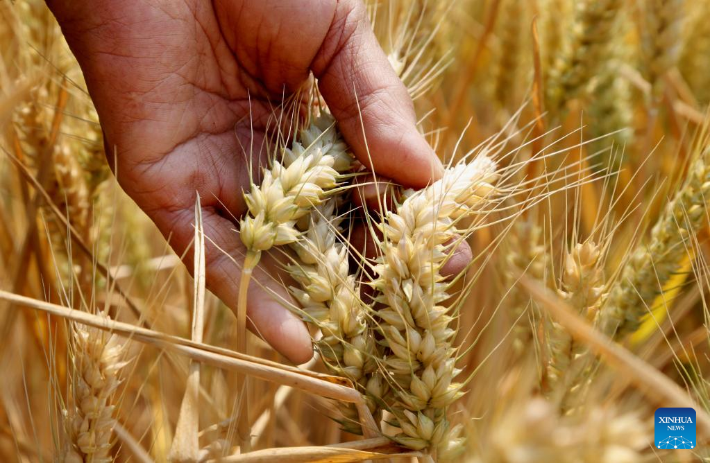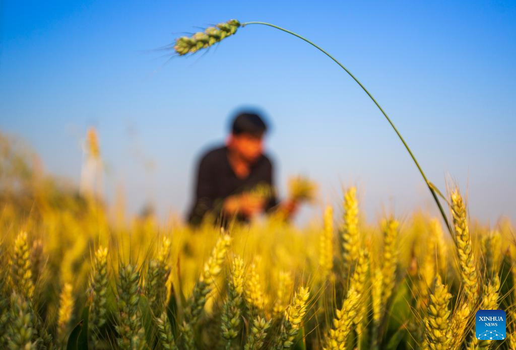 A farmer checks wheat in the fields in Guolyuzhuang Village of Xiayi County, central China's Henan Province, May 20, 2022. (Photo by Wang Gaochao/Xinhua)