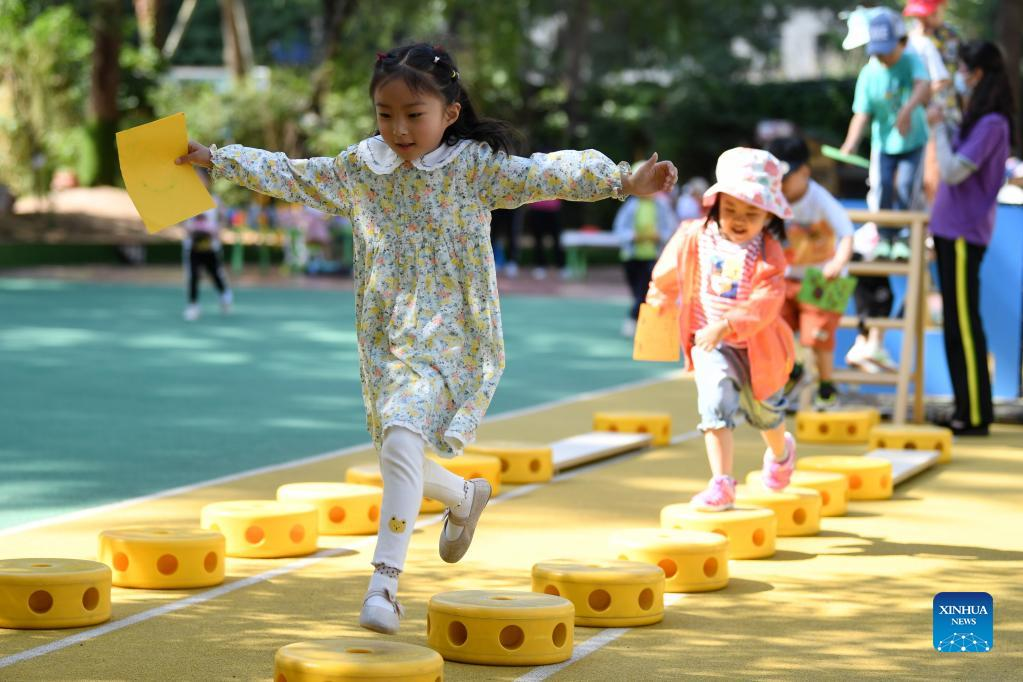 Children take part in an outdoor game to celebrate the International Children's Day at a kindergarten in Xigu District of Lanzhou, northwest China's Gansu Province, June 1, 2022. (Xinhua/Chen Bin)