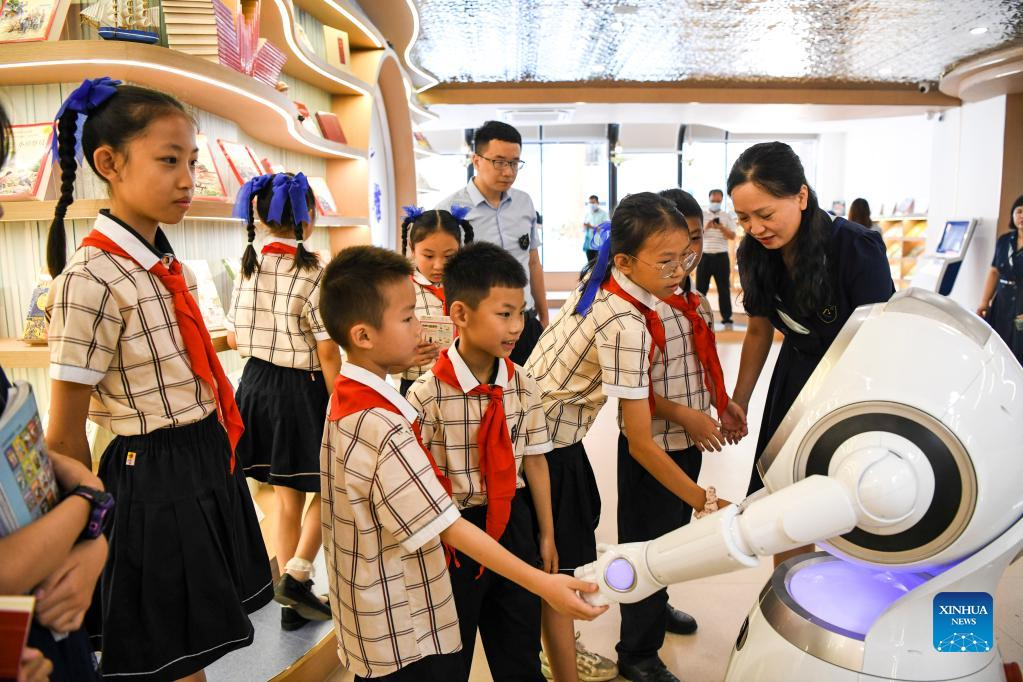 Children interact with a robot at a reading club of Binhulu primary school in Nanning, south China's Guangxi Zhuang Autonomous Region on June 1, 2022, the International Children's Day. (Xinhua/Cao Yiming)