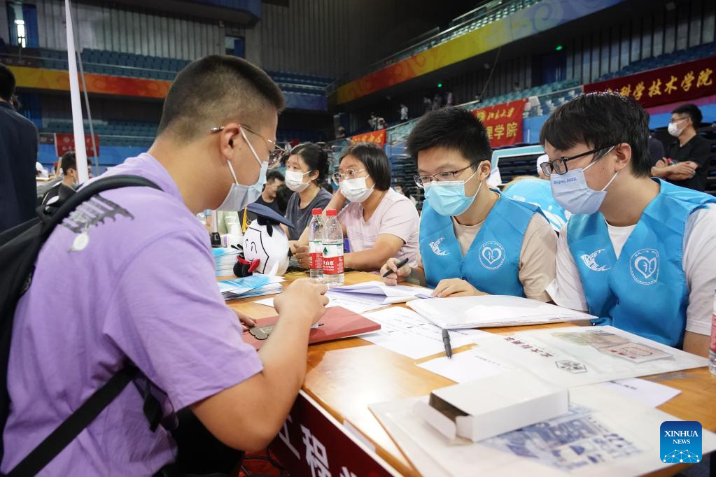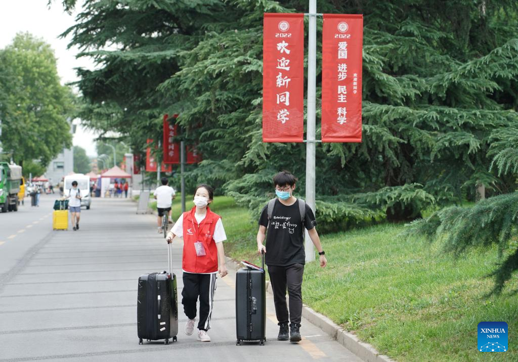 A freshman (1st L) registers at Peking University in Beijing, capital of China, on Aug. 28, 2022. Freshmen came to register at Peking University on Sunday. (Xinhua/Ren Chao)