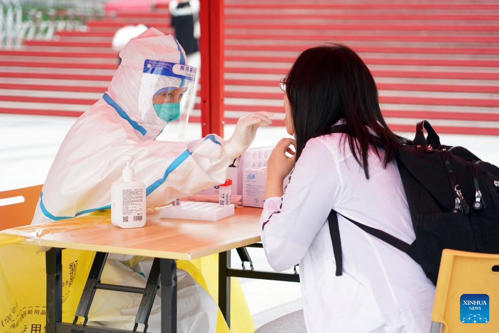 A medical worker takes a swab sample from a freshman for nucleic acid test at Peking University in Beijing, capital of China, on Aug. 28, 2022. Freshmen came to register at Peking University on Sunday. (Xinhua/Ren Chao)