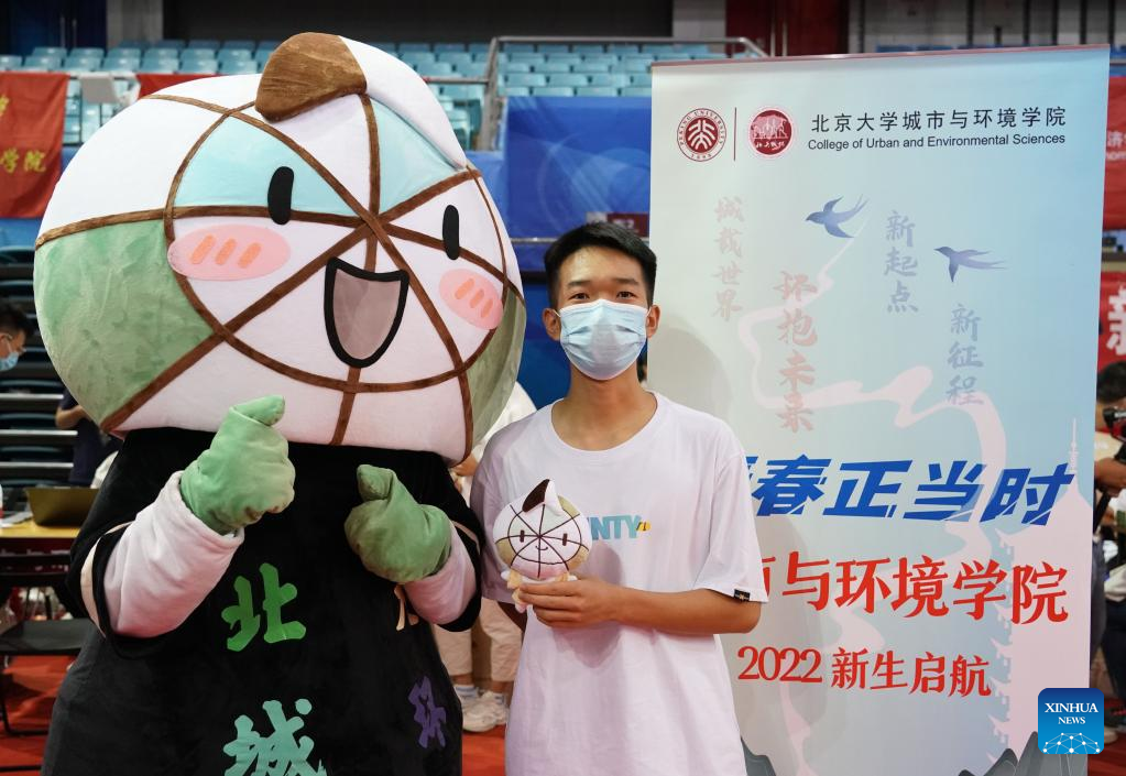 A freshman poses for a photo at Peking University in Beijing, capital of China, on Aug. 28, 2022. Freshmen came to register at Peking University on Sunday. (Xinhua/Ren Chao)