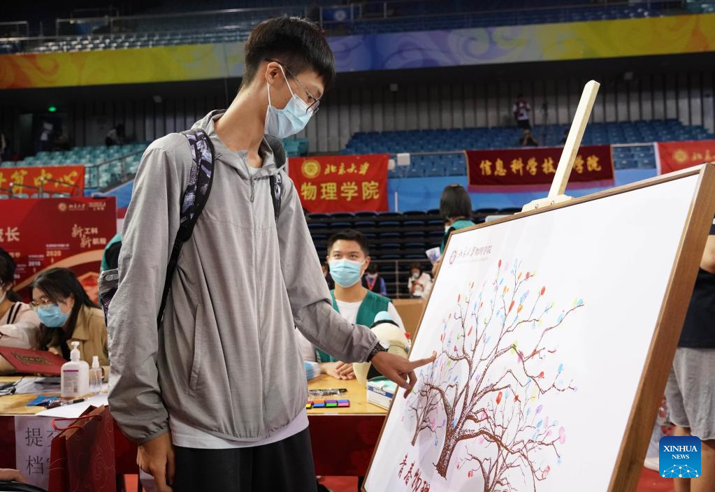 A freshman makes a fingerprint onto a painting while registering at Peking University in Beijing, capital of China, on Aug. 28, 2022. Freshmen came to register at Peking University on Sunday. (Xinhua/Ren Chao)