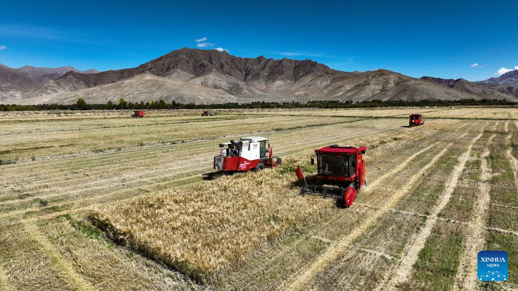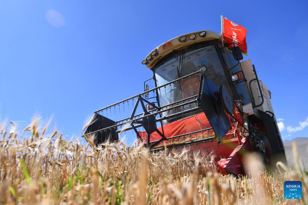 A harvester operates in the highland barley field in Rasog Township of Gyangze County, Xigaze, southwest China's Tibet Autonomous Region, Sept. 19, 2022. (Xinhua/Jigme Dorje)