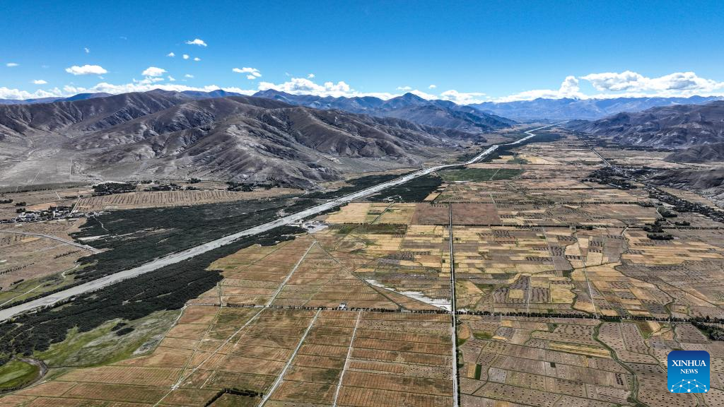 Aerial photo taken on Sept. 19, 2022 shows the highland barley field in Gyangze County, Xigaze, southwest China's Tibet Autonomous Region. (Xinhua/Jigme Dorje)