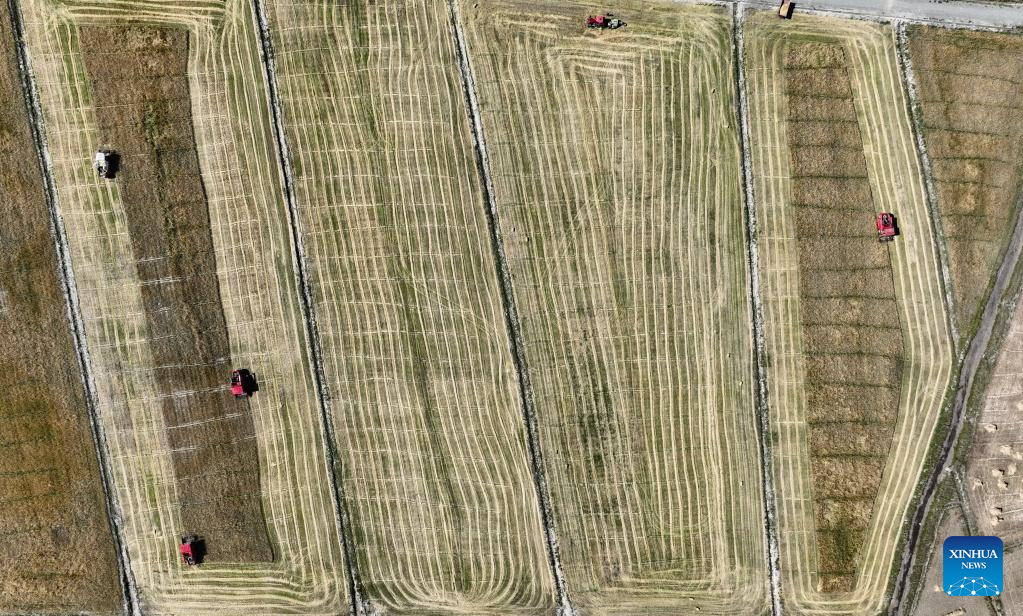 Aerial photo taken on Sept. 19, 2022 shows harvest machines operating in the highland barley field in Rasog Township of Gyangze County, Xigaze, southwest China's Tibet Autonomous Region. (Xinhua/Jigme Dorje)