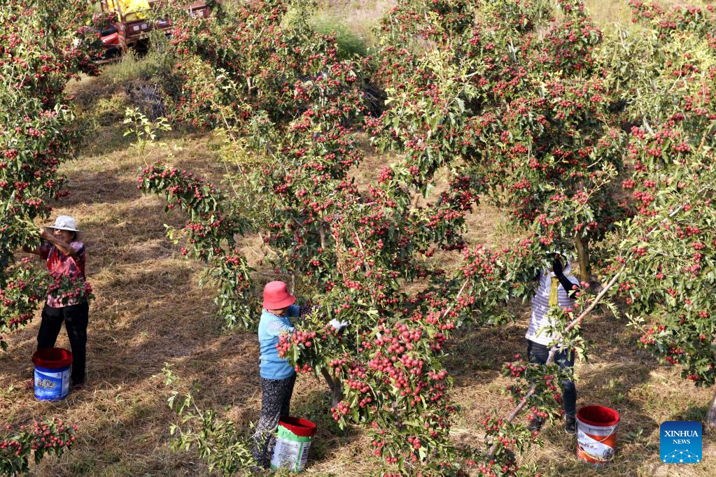 Villagers pick hawthorn fruits in Liudu Township of Xintai City, east China's Shandong Province, Sept. 21, 2022. Over 23,000 mu (about 1,533 hectares) of hawthorn fruits have entered the mature season here. (Xinhua/Fan Changguo)