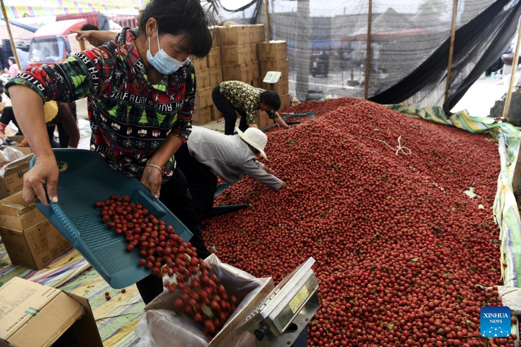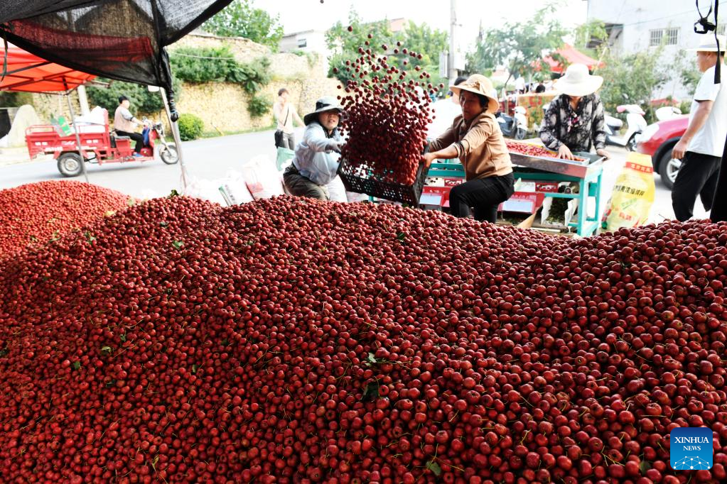 Buyers select hawthorn fruits in a trading market in Liudu Township of Xintai City, east China's Shandong Province, Sept. 21, 2022. Over 23,000 mu (about 1,533 hectares) of hawthorn fruits have entered the mature season here. (Xinhua/Fan Changguo)