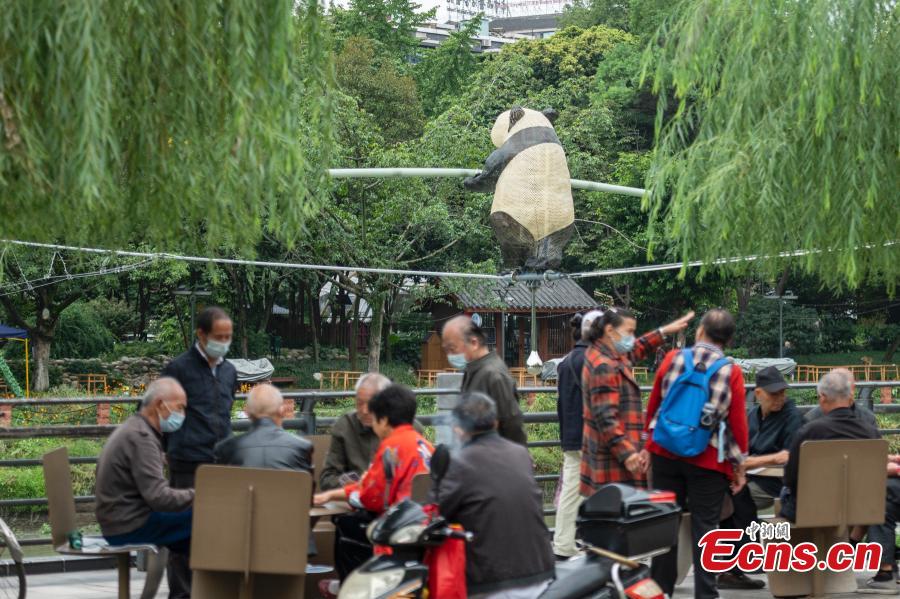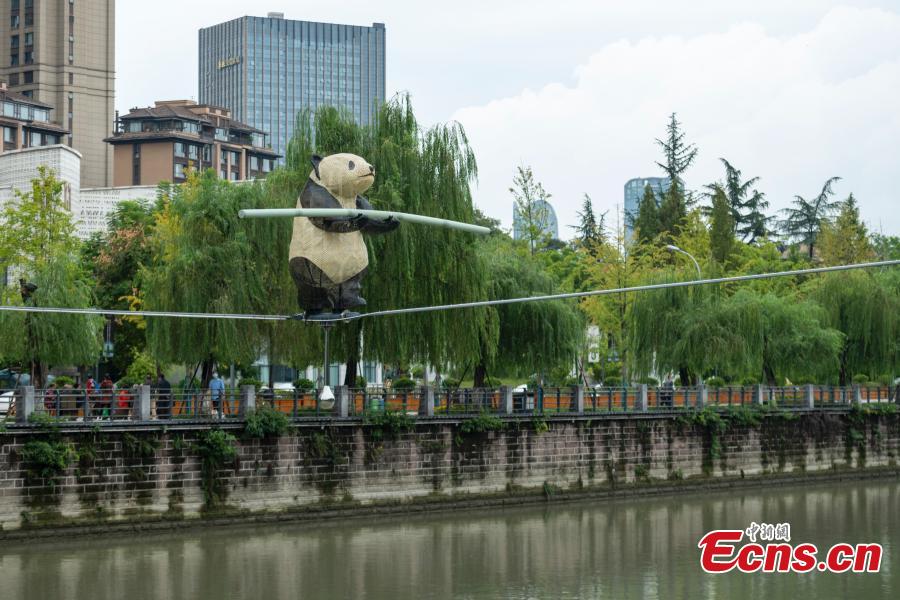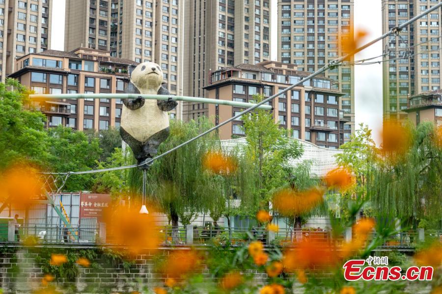 A bamboo-woven giant panda stands on a tightrope across Fuhe River in Chengdu, southwest China's Sichuan Province, adding fun to the city, Sept. 27, 2022. (Photo: China News Service/Liu Zhongjun)