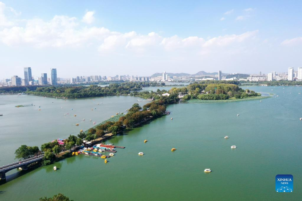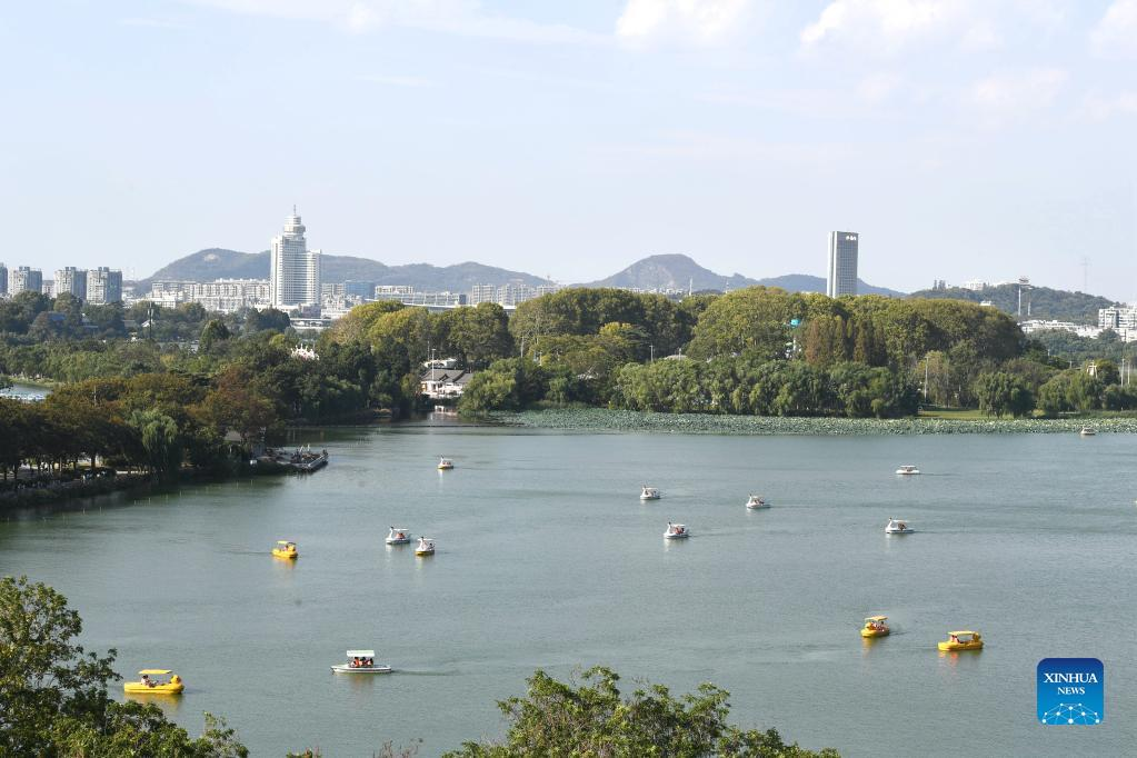 Aerial photo taken on Oct. 3, 2022 shows tourists taking boats at the Xuanwu Lake Park in Nanjing, east China's Jiangsu Province. (Photo by Yang Suping/Xinhua)