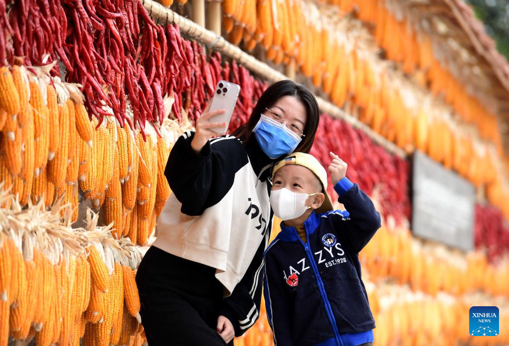 Tourists pose with corps in Duanzhuang Village of Shijiazhuang, capital of north China's Hebei Province, Oct. 5, 2022. (Photo by Chen Qibao/Xinhua)