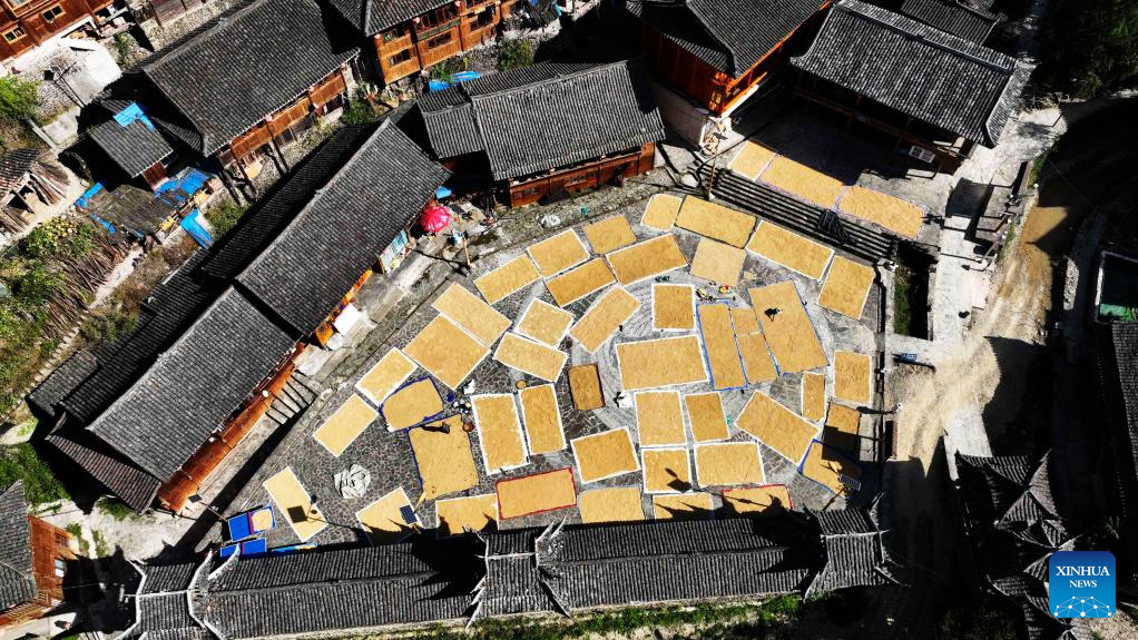 Aerial photo taken on Oct. 5, 2022 shows villagers drying rice in Hongyang Village, Taijiang County of southwest China's Guizhou Province. (Photo by Yang Xiaohai/Xinhua)