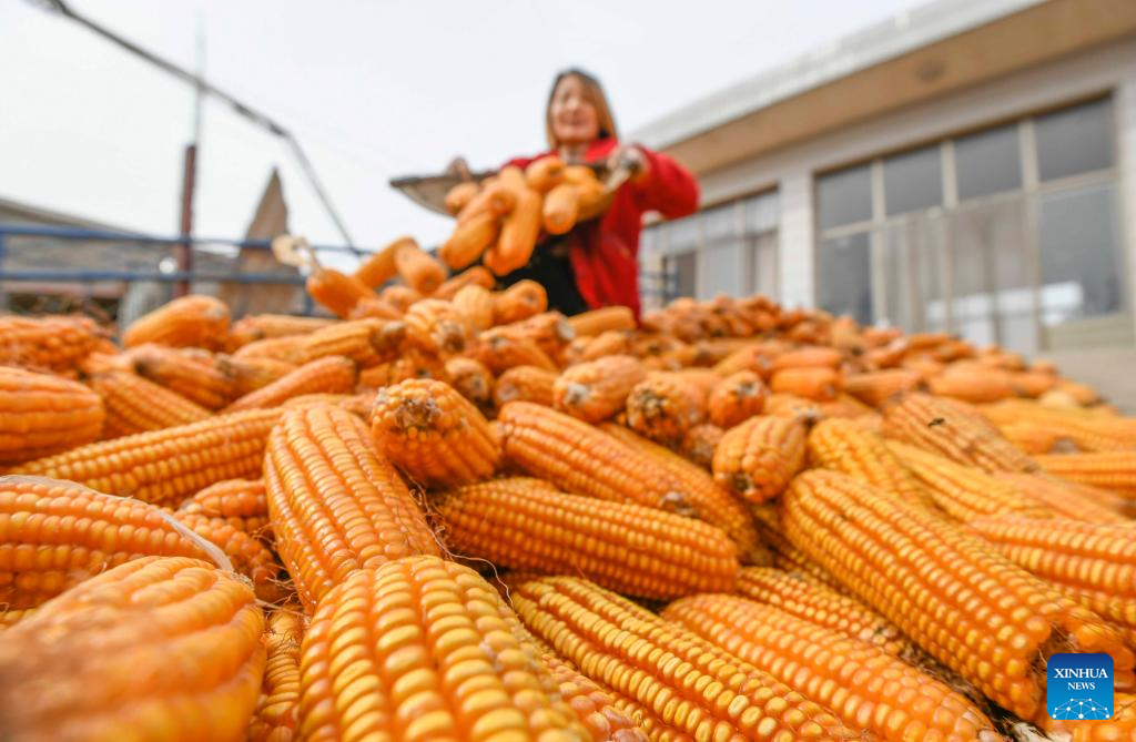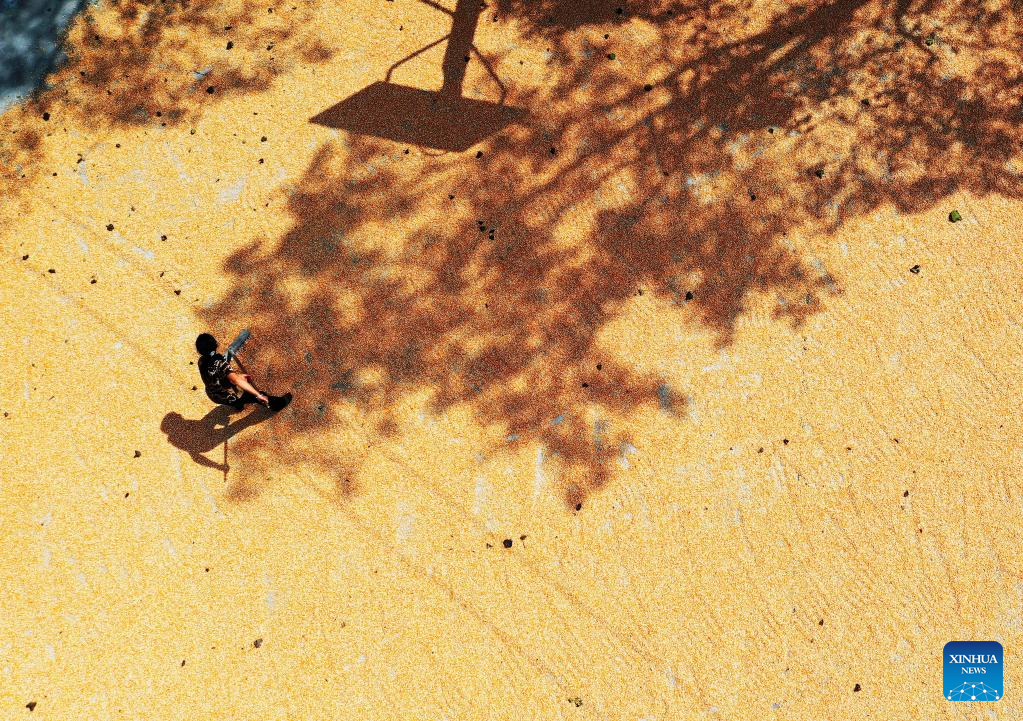 A villager dries corn in Nianyuchi Village of Zunhua, north China's Hebei Province, Oct. 5, 2022. (Photo by Liu Mancang/Xinhua)