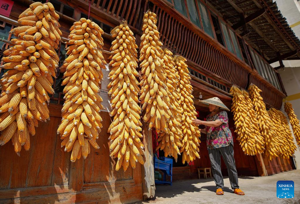 A villager dries corn in Zhongying Village of Xingren Township in Danzhai County, southwest China's Guizhou Province, Oct. 5, 2022. (Photo by Huang Xiaohai/Xinhua)