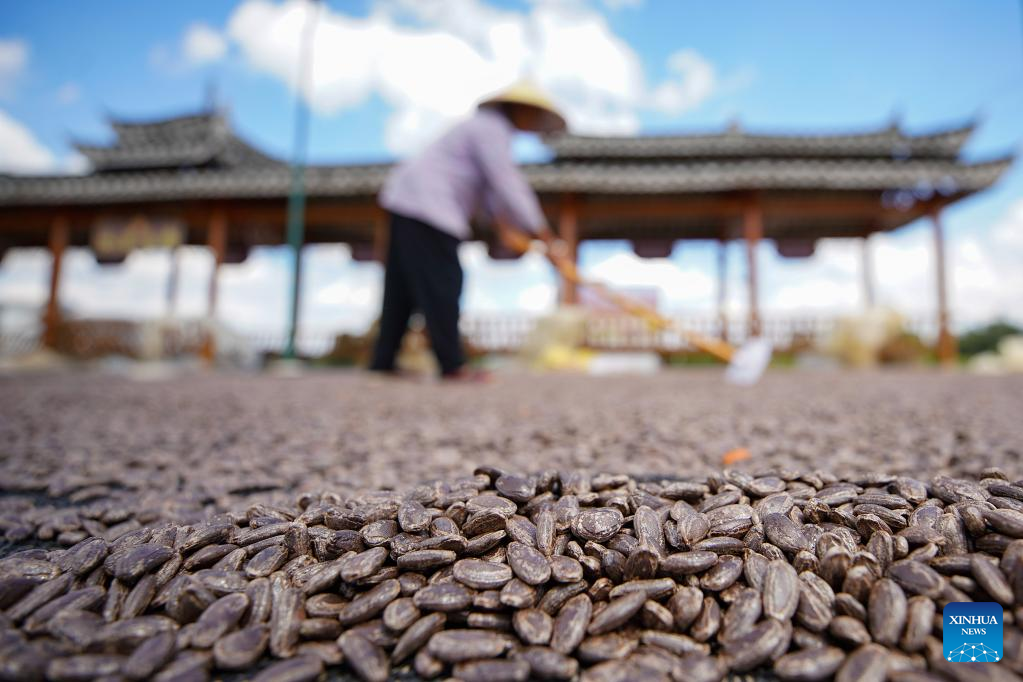 A villager dries melon seeds in Shaocha Village of Xingren Township in Danzhai County, southwest China's Guizhou Province, Oct. 5, 2022. (Photo by Huang Xiaohai/Xinhua)