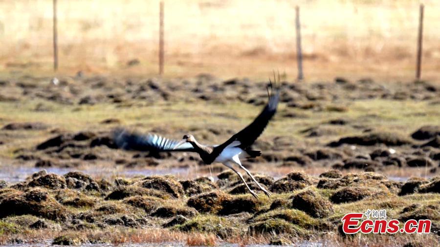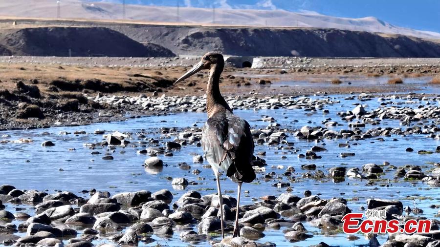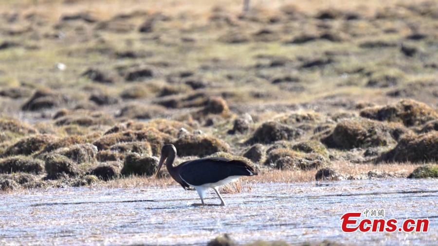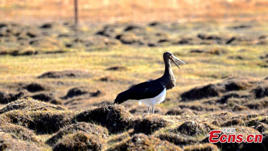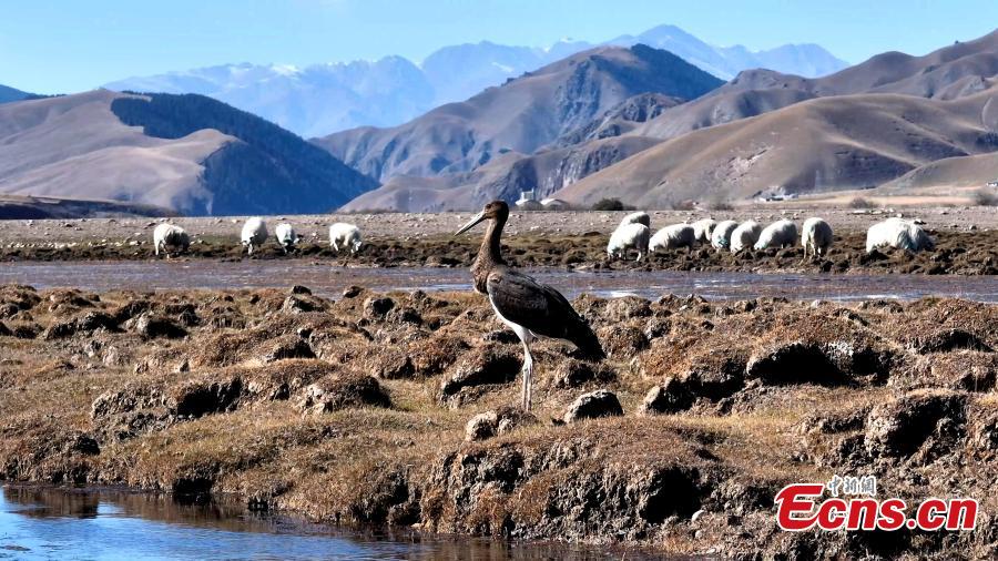A black stork is captured resting in Qilian Mountain National Park in northwest China's Qinghai Province. (Photo: China News Service/Bao Lei)