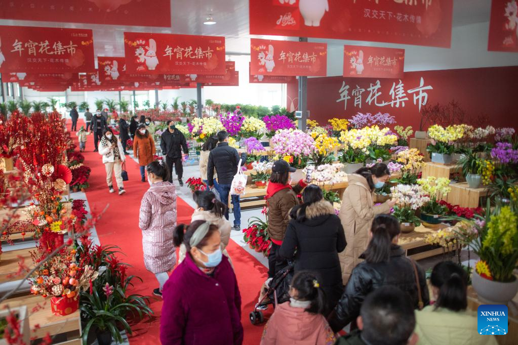 People visit a flower market in Wuhan, central China's Hubei Province, Jan. 1, 2023. The three-day New Year holiday witnessed a strong recovery in tourism, catering and retail sales across the country. (Xinhua/Xiao Yijiu)