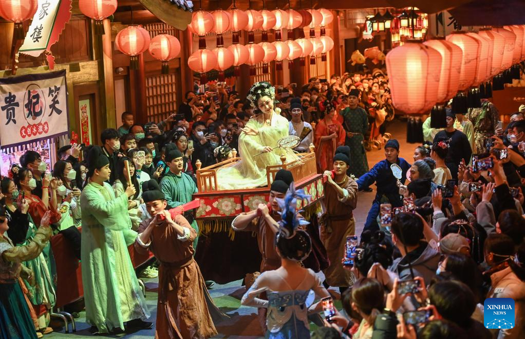 Tourists watch a performance at a theme community of Tang Dynasty in Xi'an, northwest China's Shaanxi Province, Dec. 31, 2022. The three-day New Year holiday witnessed a strong recovery in tourism, catering and retail sales across the country. (Photo by Zou Jingyi/Xinhua)