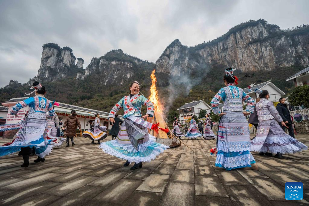 Tourists dance with people of Miao ethnic group in Huawu Village of Xinren Miao Township, Qianxi City, southwest China's Guizhou Province, Jan. 2, 2023. The three-day New Year holiday witnessed a strong recovery in tourism, catering and retail sales across the country. (Photo by Luo Dafu/Xinhua)