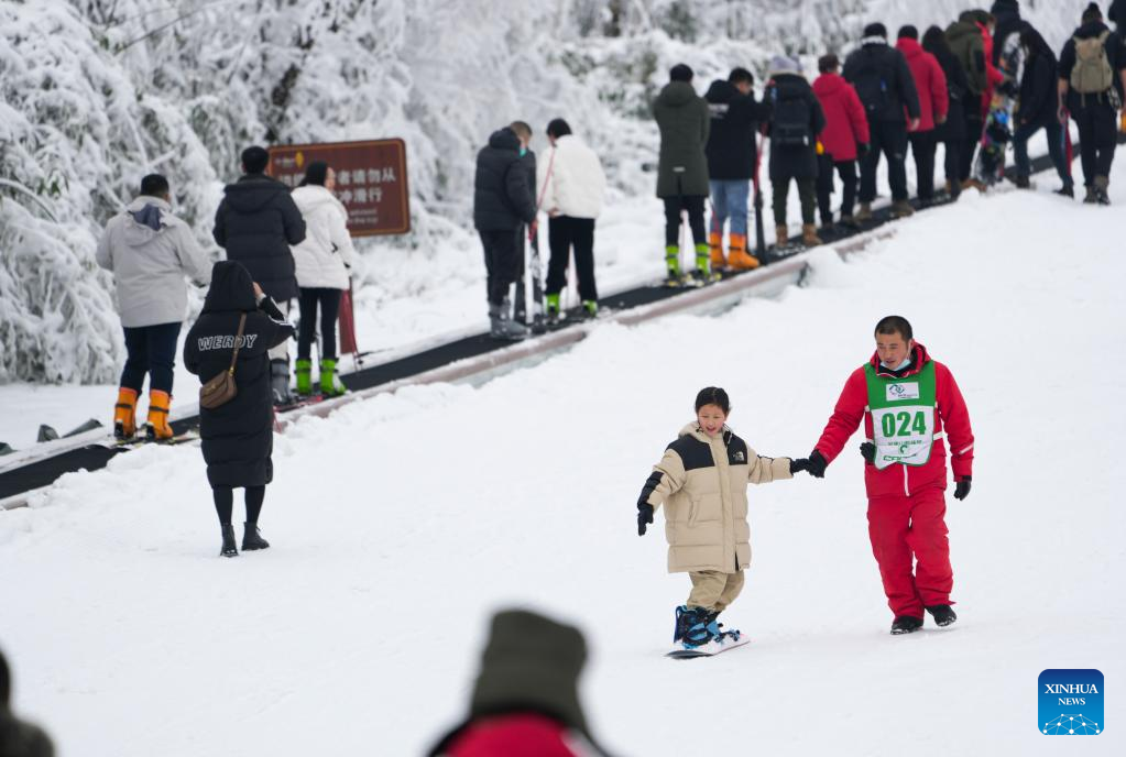 A young tourist practices skiing under the guidance of an instructor at a ski resort in Chongqing, southwest China, Jan. 1, 2023. The three-day New Year holiday witnessed a strong recovery in tourism, catering and retail sales across the country. (Xinhua/Liu Chan)