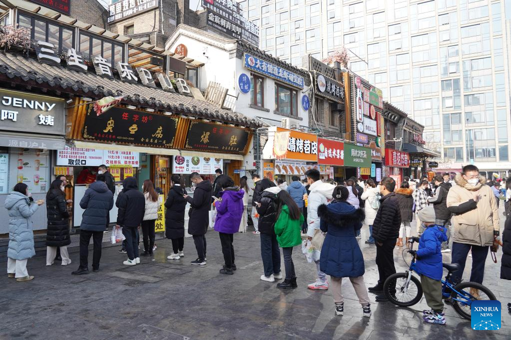 Tourists line up to buy food in Jinan, east China's Shandong Province, Jan. 1, 2023. The three-day New Year holiday witnessed a strong recovery in tourism, catering and retail sales across the country. (Xinhua/Zhu Zheng)