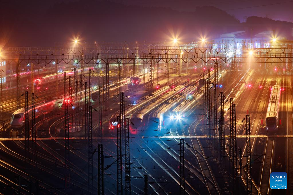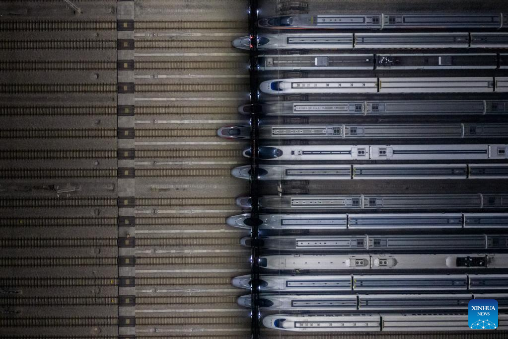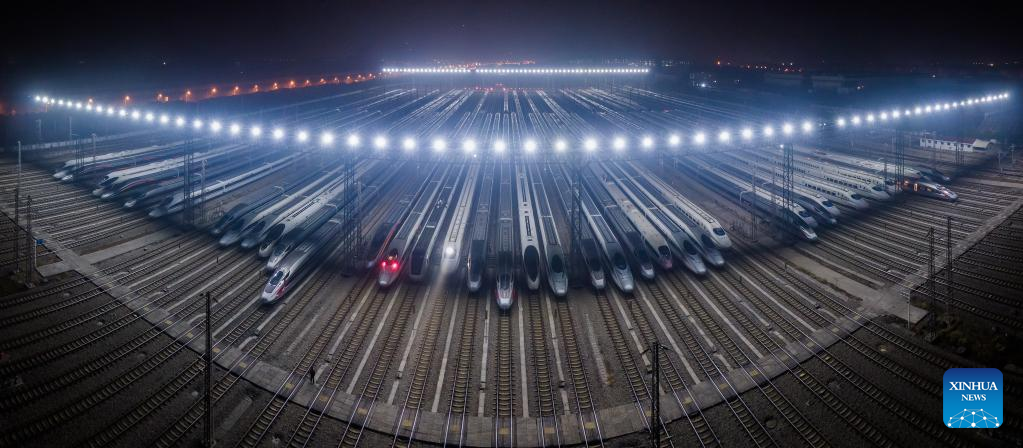 This photo shows bullet trains in a maintenance base in Guiyang, capital of southwest China's Guizhou Province, Jan. 6, 2023. The Spring Festival travel rush this year, will continue for 40 days from Jan. 7 to Feb. 15. (Xinhua/Liu Xu)