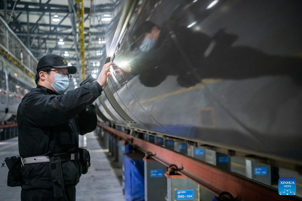 A worker examines a train at a maintenance base in Wuhan, central China's Hubei Province, Jan. 6, 2023. The Spring Festival travel rush this year, will continue for 40 days from Jan. 7 to Feb. 15. (Xinhua/Wu Zhizun)