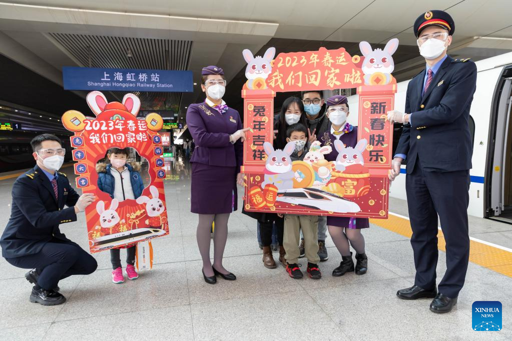 Passengers and stewards pose for a photo at Shanghai Hongqiao Railway Station in east China's Shanghai, Jan. 7, 2023. The 40-day Spring Festival travel rush in China kicked off Saturday. (Xinhua/Wang Xiang)