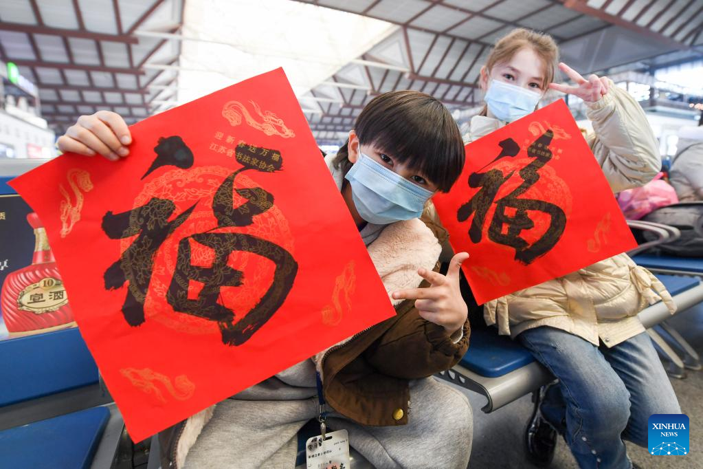 Passengers pose for photos in the waiting hall at Suzhou Railway Station in Suzhou, east China's Jiangsu Province, Jan. 7, 2023. The Spring Festival travel rush will continue for 40 days from Jan. 7 to Feb. 15 this year,. (Xinhua/Li Bo)
