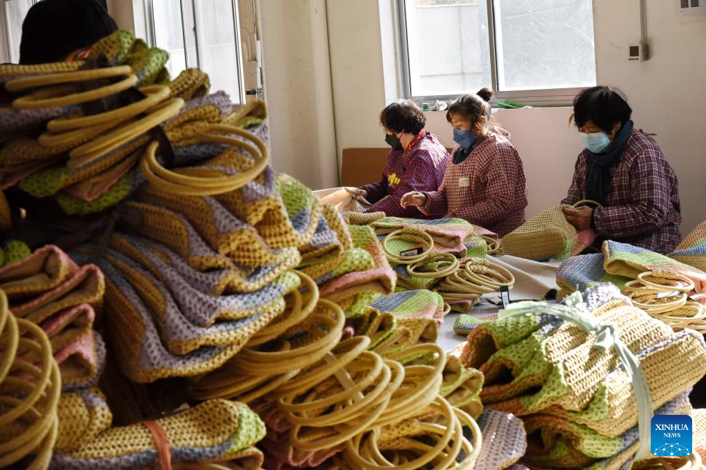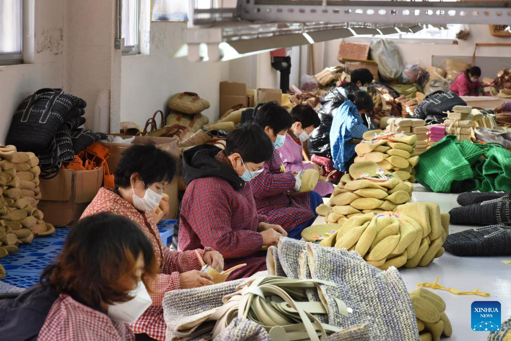 Employees process straw weaving at a handicraft factory in Pingdu, east China's Shandong Province, Jan. 10, 2023. Xinhe straw weaving, an intangible cultural heritage of Shandong Province, has a history of more than 300 years. So far, over 80 straw weaving enterprises have been set up in Xinhe Town, offering job opportunities for more than 20,000 people. (Xinhua/Li Ziheng)