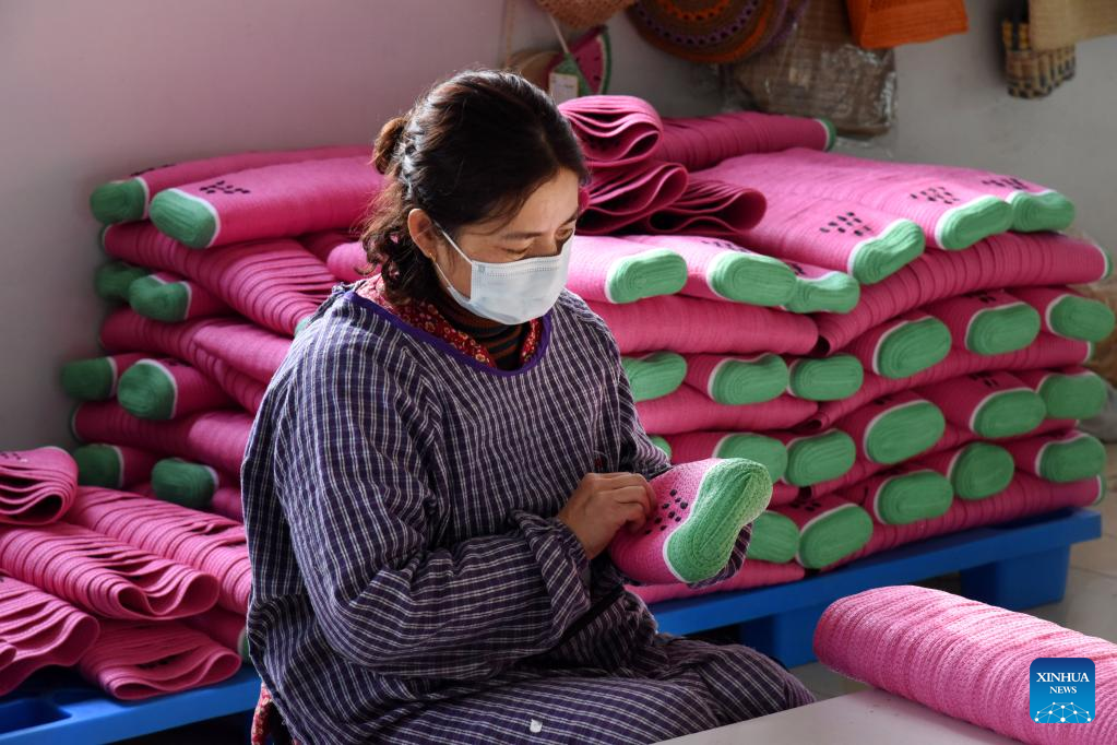 An employee makes straw weaving products at a handicraft factory in Pingdu, east China's Shandong Province, Jan. 10, 2023. Xinhe straw weaving, an intangible cultural heritage of Shandong Province, has a history of more than 300 years. So far, over 80 straw weaving enterprises have been set up in Xinhe Town, offering job opportunities for more than 20,000 people. (Xinhua/Li Ziheng)