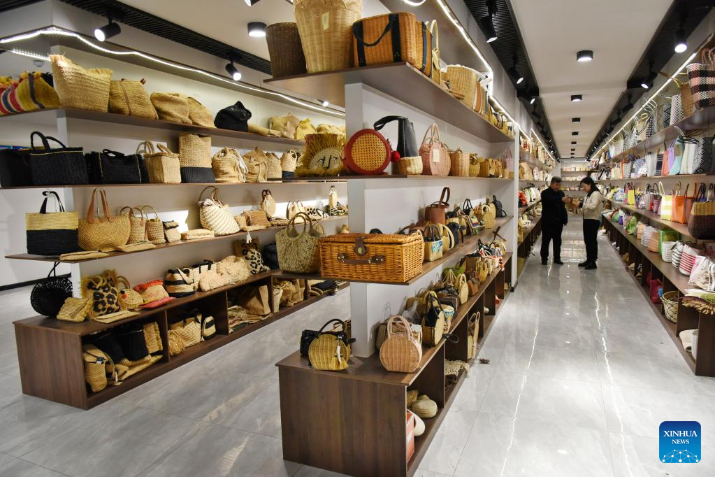 This photo taken on Jan. 10, 2023 shows straw weaving products at the showroom of a handicraft enterprise in Xinhe Town, Pingdu City, east China's Shandong Province. Xinhe straw weaving, an intangible cultural heritage of Shandong Province, has a history of more than 300 years. So far, over 80 straw weaving enterprises have been set up in Xinhe Town, offering job opportunities for more than 20,000 people. (Xinhua/Li Ziheng)