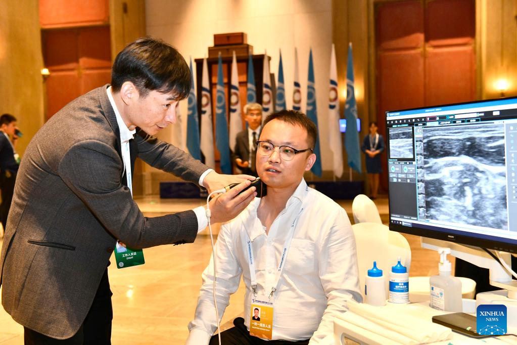 A man experiences an ultrasound diagnosis system based on AI technology at the World Internet Conference Nishan Dialogue on Digital Civilization in Qufu, east China's Shandong Province, June 26, 2023. Themed "The Age of AI: Building a Digital World of Exchanges, Mutual Learning and Inclusiveness," the dialogue invited several hundred high-level representatives from governmental departments, business sectors, and academic and research institutions worldwide to attend the event in person or via video link. (Xinhua/Guo Xulei)