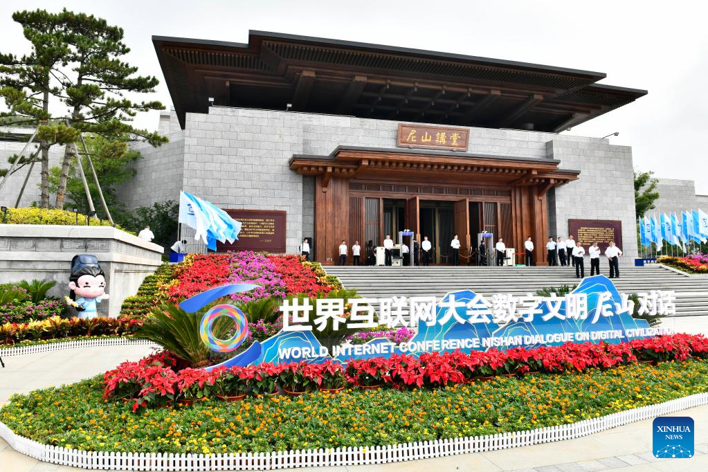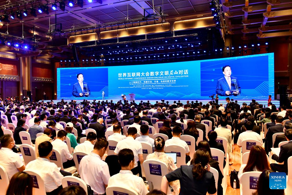 This photo taken on June 26, 2023 shows the opening ceremony of the World Internet Conference Nishan Dialogue on Digital Civilization in Qufu, east China's Shandong Province. Themed "The Age of AI: Building a Digital World of Exchanges, Mutual Learning and Inclusiveness," the dialogue invited several hundred high-level representatives from governmental departments, business sectors, and academic and research institutions worldwide to attend the event in person or via video link. (Xinhua/Guo Xulei)