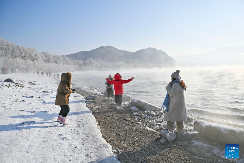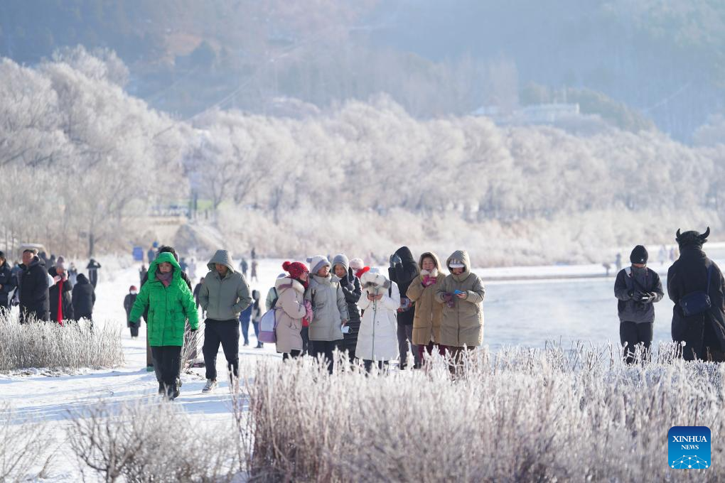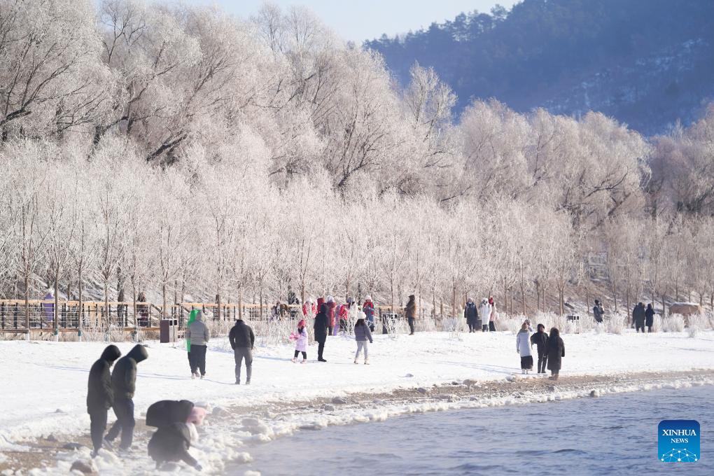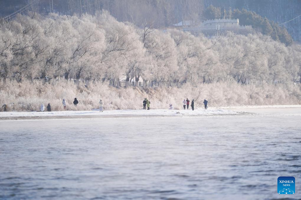 People enjoy the rime scenery along the Songhua River in Jilin City, northeast China's Jilin Province, Jan. 26, 2024. (Xinhua/Chen Yehua)