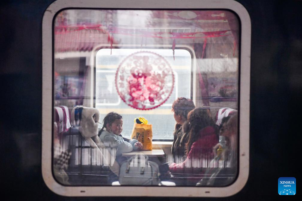This photo taken on Feb. 4, 2024 shows passengers aboard the train No. 7503 in northwest China's Gansu Province. The pair of "slow trains" No. 7503 and No. 7504 run between Tianshui and Longxi in Gansu. Local residents are now taking them to travel between their towns and the urban areas to shop for goods in preparation of the upcoming Chinese Lunar New Year, or the Spring Festival. (Xinhua/Chen Bin)
