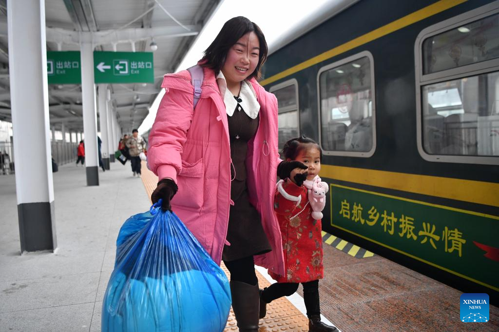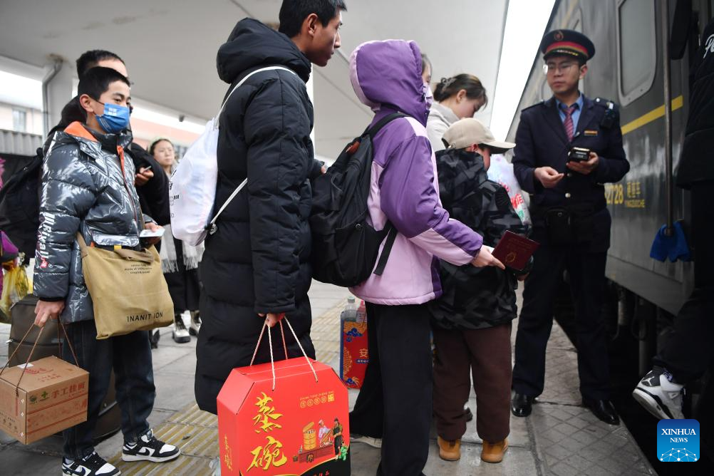 This photo taken on Feb. 4, 2024 shows passengers boarding the train No. 7503 at the Tianshui Railway Station in Tianshui, northwest China's Gansu Province. The pair of "slow trains" No. 7503 and No. 7504 run between Tianshui and Longxi in Gansu. Local residents are now taking them to travel between their towns and the urban areas to shop for goods in preparation of the upcoming Chinese Lunar New Year, or the Spring Festival. (Xinhua/Fang Xin)