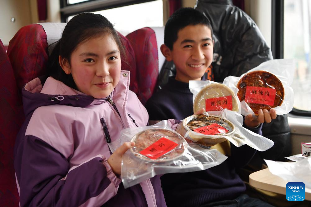 Passengers show their newly bought festive food on the train No. 7503 in northwest China's Gansu Province, Feb. 4, 2024. The pair of "slow trains" No. 7503 and No. 7504 run between Tianshui and Longxi in Gansu. Local residents are now taking them to travel between their towns and the urban areas to shop for goods in preparation of the upcoming Chinese Lunar New Year, or the Spring Festival. (Xinhua/Fang Xin)