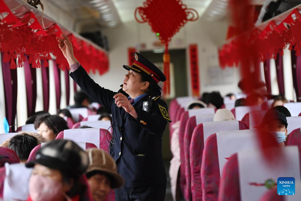 Train conductor Liu Qiumei checks the luggage rack on the train No. 7503 in northwest China's Gansu Province, Feb. 4, 2024. The pair of "slow trains" No. 7503 and No. 7504 run between Tianshui and Longxi in Gansu. Local residents are now taking them to travel between their towns and the urban areas to shop for goods in preparation of the upcoming Chinese Lunar New Year, or the Spring Festival. (Xinhua/Chen Bin)