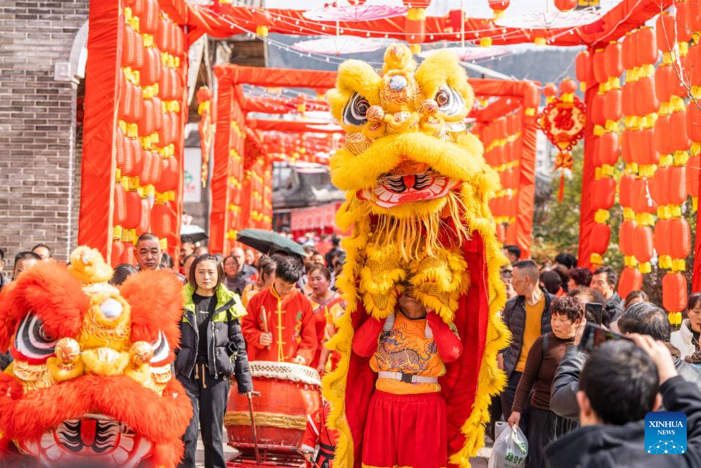Tourists watch a lion dance in Bijie City, southwest China's Guizhou Province, Feb. 11, 2024. Chinese people celebrate the Spring Festival through various ways during their holiday. (Photo by Luo Dafu/Xinhua)