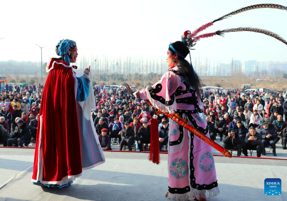 People watch an opera show in Nanyang, central China's Henan Province, Feb. 11, 2024. Chinese people celebrate the Spring Festival through various ways during their holiday. (Photo by Gao Song/Xinhua)
