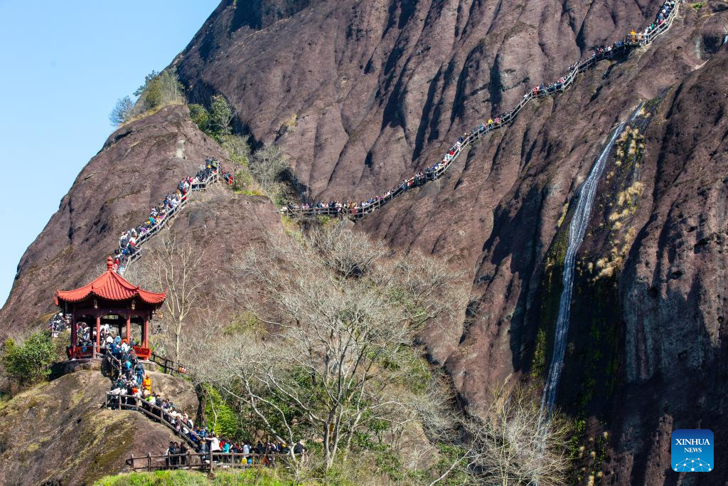 Tourists visit a scenic area of Wuyi Mountains in southeast China's Fujian Province, Feb. 11, 2024. Chinese people celebrate the Spring Festival through various ways during their holiday. (Photo by Chen Ying/Xinhua)