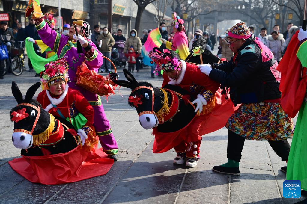 Villagers perform Yangge, a traditional folk dance, in Liaocheng, east China's Shandong Province, Feb. 11, 2024. China on Saturday ringed in the Chinese Lunar New Year, or Spring Festival. Regarded as the most celebrated holiday among Chinese, it signifies a time of joyful family reunions and a slew of cultural events. (Photo by Zhang Zhenxiang/Xinhua)