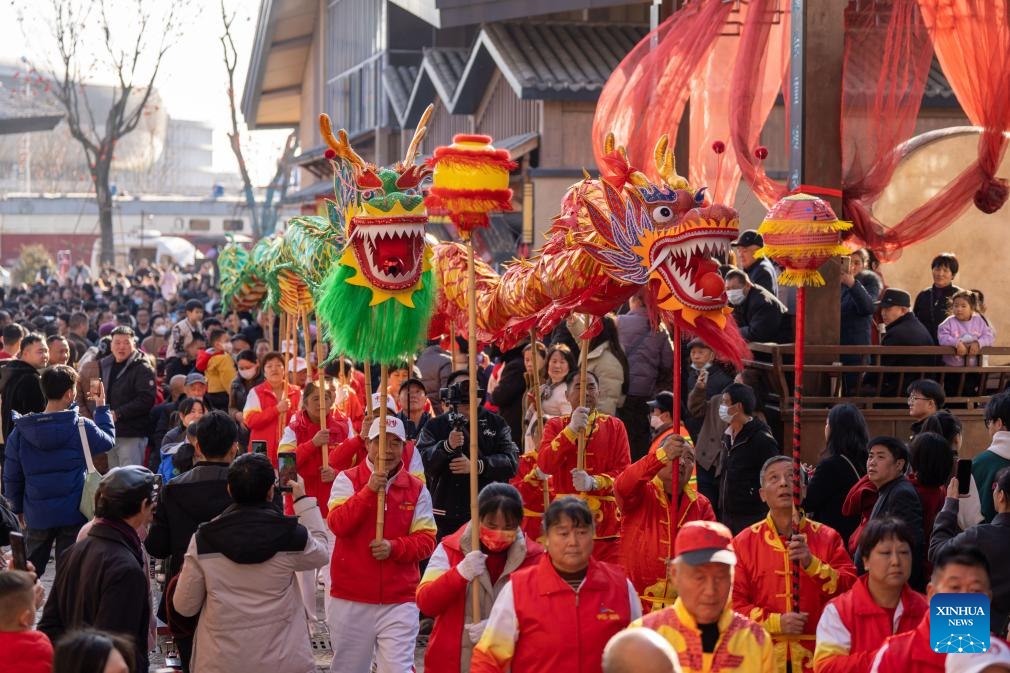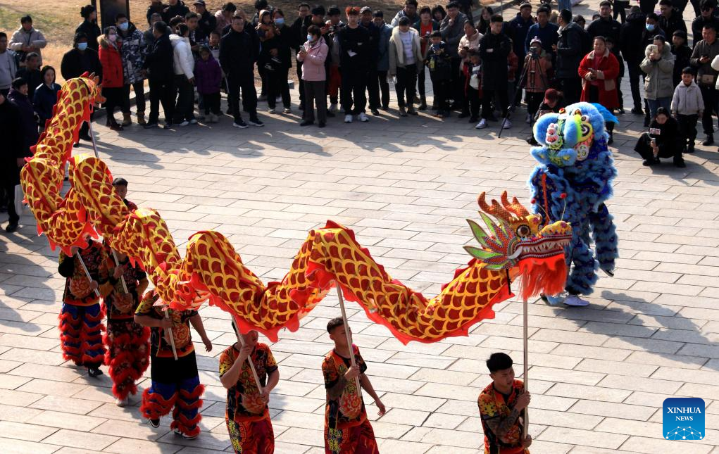 Folk artists perform dragon dance and lion dance in Pingyi County, east China's Shandong Province, Feb. 11, 2024. China on Saturday ringed in the Chinese Lunar New Year, or Spring Festival. Regarded as the most celebrated holiday among Chinese, it signifies a time of joyful family reunions and a slew of cultural events. (Photo by Wu Jiquan/Xinhua)