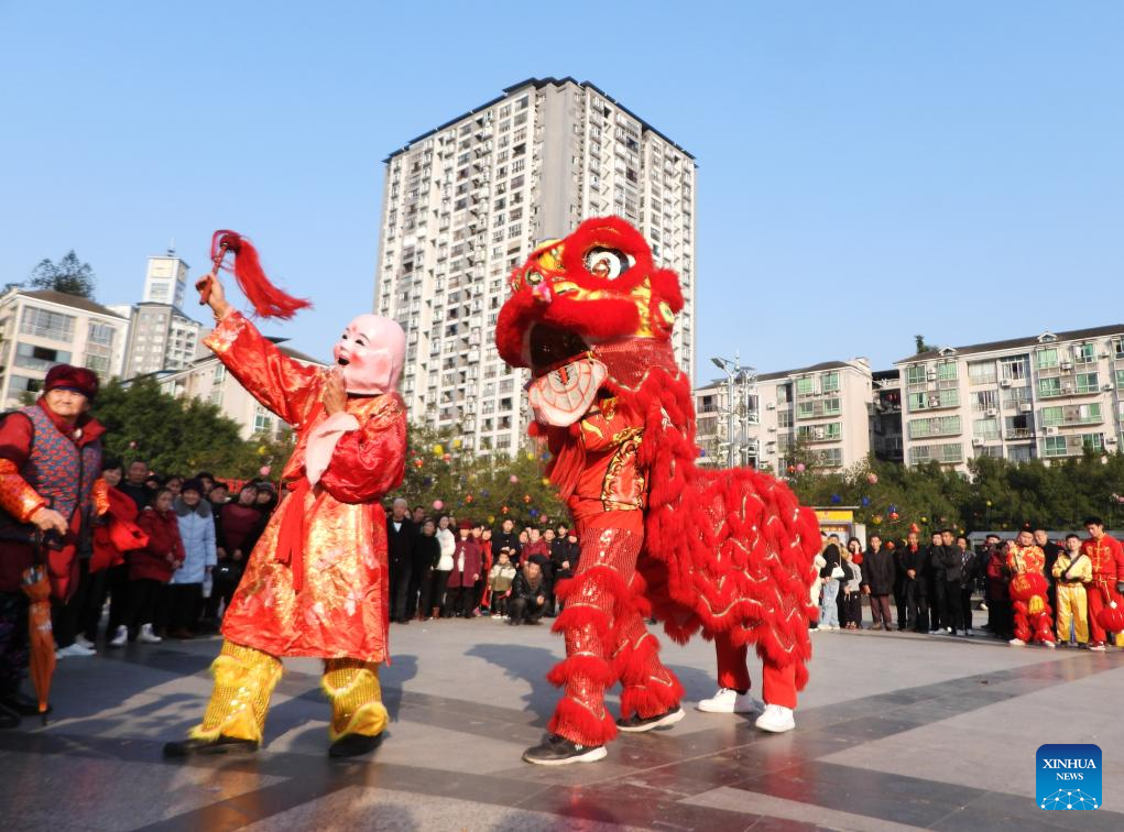 Folk artists perform lion dance in Dazhou, southwest China's Sichuan Province, Feb. 11, 2024. Chinese people celebrate the Spring Festival through various ways during their holiday. (Photo by Deng Liangkui/Xinhua)