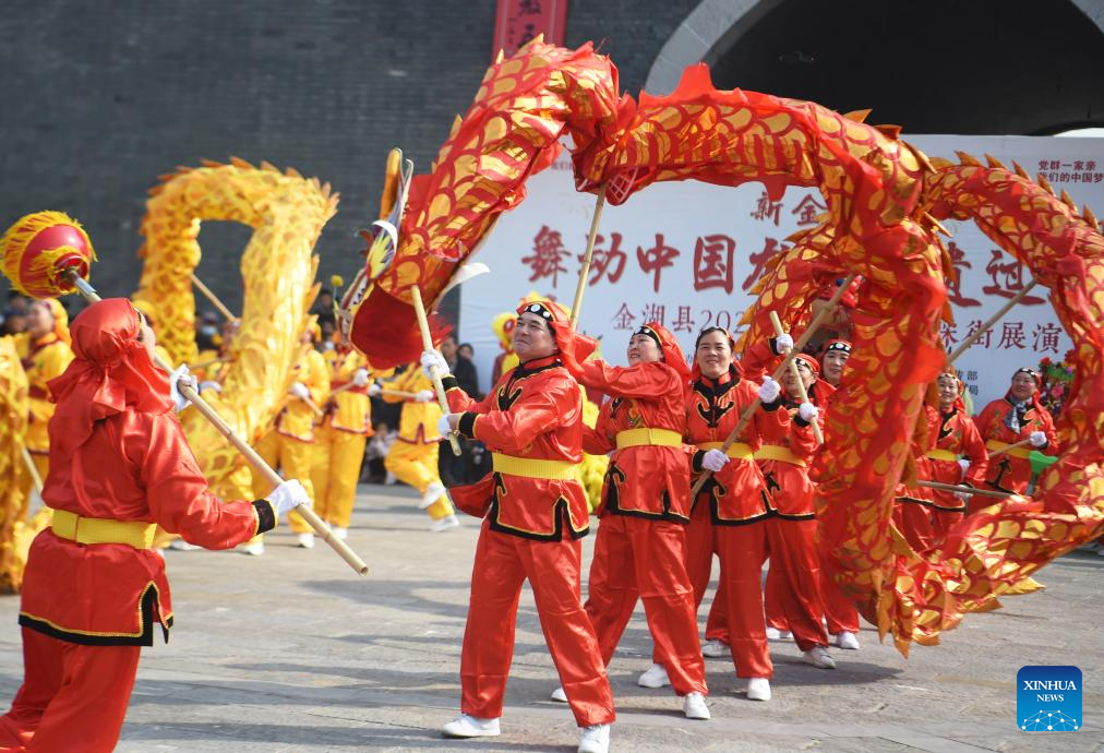 Folk artists perform dragon dance in Jinhu County, east China's Jiangsu Province, Feb. 11, 2024. China on Saturday ringed in the Chinese Lunar New Year, or Spring Festival. Regarded as the most celebrated holiday among Chinese, it signifies a time of joyful family reunions and a slew of cultural events. (Photo by Chen Yibao/Xinhua)