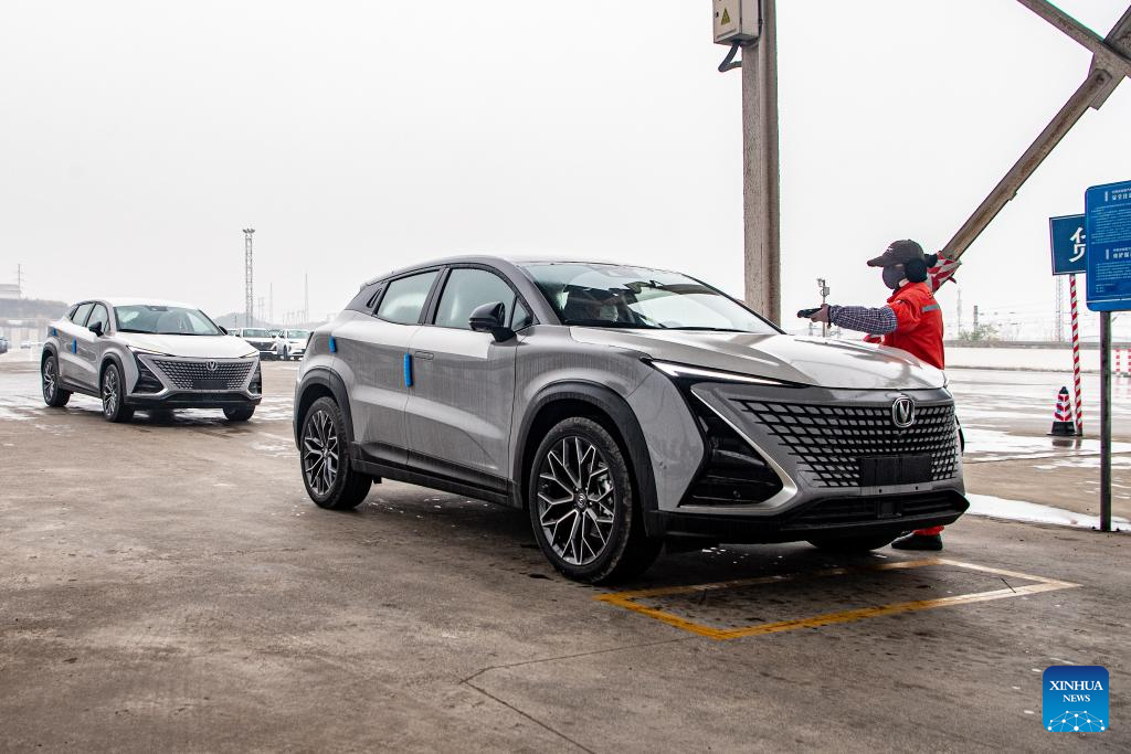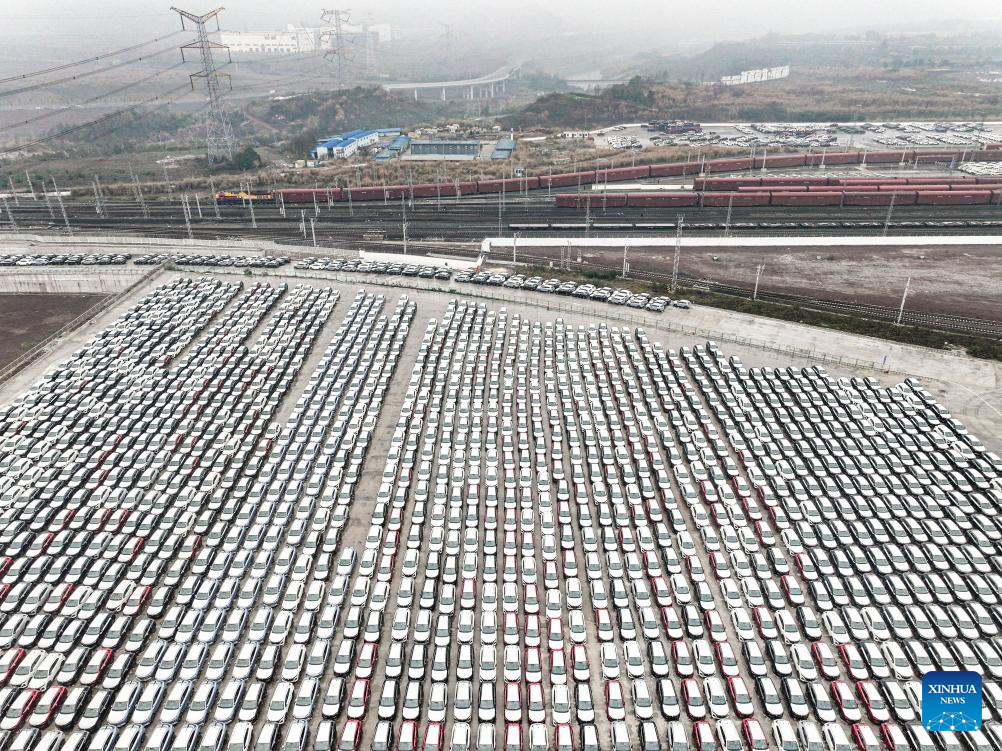 Finished vehicles wait to be exported via China-Europe freight trains at Yuzui Station in Jiangbei District of southwest China's Chongqing Municipality, March 6, 2024. In 2023, more than 110,000 finished vehicles have been exported via the China-Europe freight trains departing from Chongqing. Meanwhile, the city also witnessed a significant growth in finished car imports via the China-Europe freight train service. (Xinhua/Tang Yi)