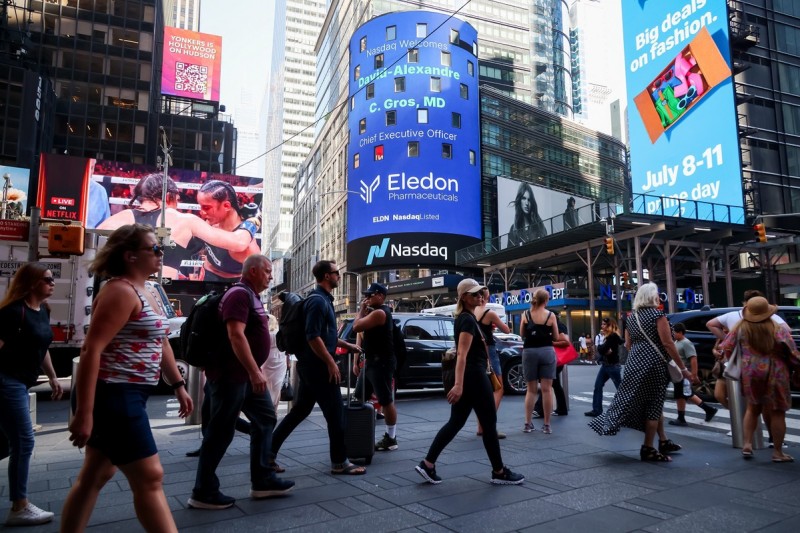 People walk pass the Nasdaq MarketSite in New York City in July. US Big Tech companies employ a large number of foreign workers holding H-1B visas. MICHAEL NAGLE/GETTY IMAGES