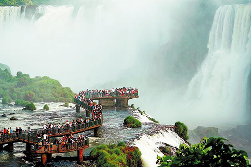 Tourists admire the Brazilian side of the Iguazu Falls, the longest series of waterfalls in the world and one of the Seven Natural Wonders of the World, in November.[Photo provided to China Daily]