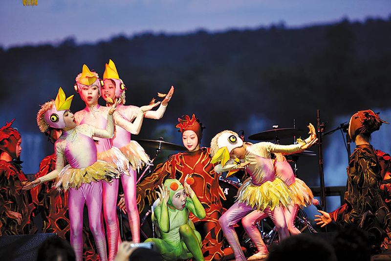 Students from Macao perform in front of the Iguazu Falls during a cultural event celebrating Chinese New Year, jointly organized by the Chinese embassy in Brazil and the Foz do Iguacu city government, in February 2024.[Photo by Lin Chunyin/China News Service]